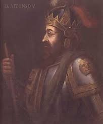 D. Afonso V nasceu a 1432 e morreu em 1481. O seu reinado durou 33 anos e foi o terceiro rei da Dinastia de Avis. O seu cognome está relacionado com as expedições militares no norte de África. Ao contrário do seu precedente, investiu em conquistas no norte de África invés duma política expansionista. Conquistou Tânger, Arzila e Alcácer-Ceguer, as quais eram praças norte Africanas. O objectivo era não deixar Ceuta isolada. No seu reinado foi também assinado o contrato de 5 anos (1469 - 1474) com o mercador Fernão Gomes para que os descobrimentos não fossem deixados de parte.